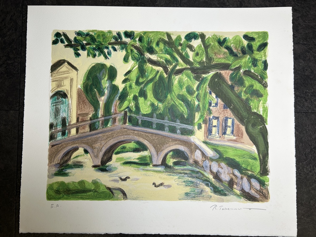 『竹村良子 EA版「橋のある風景」パステル画 夫:竹村健一 サイン インテリア 応接』