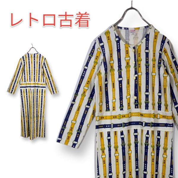 - 昭和レトロ ヴィンテージ vintage ナイトウェア ワンピース ルームウェア 部屋着 Mサイズ ベルト柄 総柄 長袖 パジャマ AMOUR