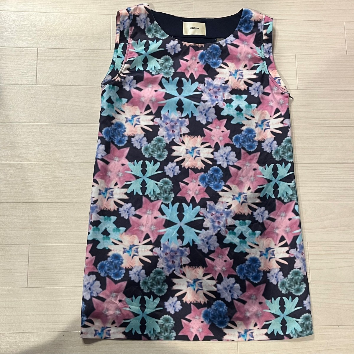 > MURUA ムルーア 総柄 花柄 ノースリーブワンピース Iライン 裏地あり サイドファスナー ひざ上丈 レディース パープル フリーサイズ