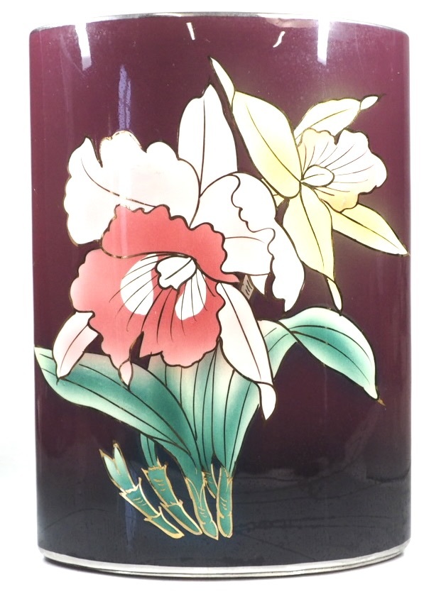 - 上品な色合いと美しい花の装飾が魅力的な逸品!昭和ビンテージ 富士七宝陶器 「カトレア」花瓶 花器 1980年代 KEN512