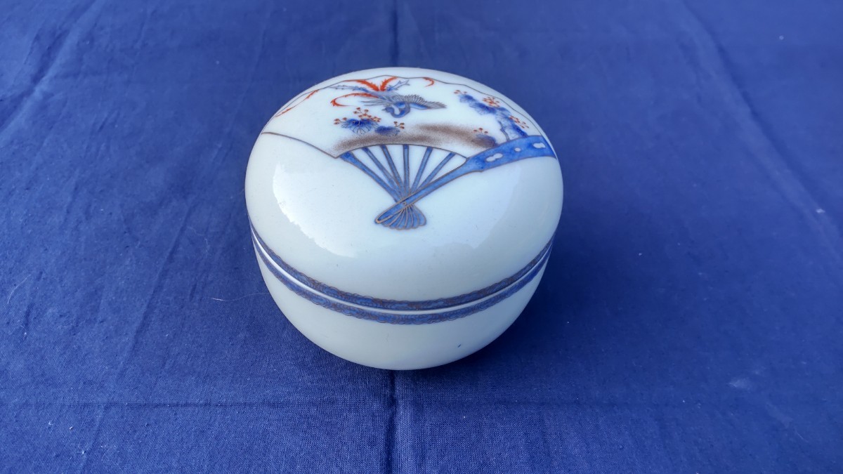 - オールド深川 蓋物 ボンボニエール 扇面に鳳凰染付 推定大正~昭和初期