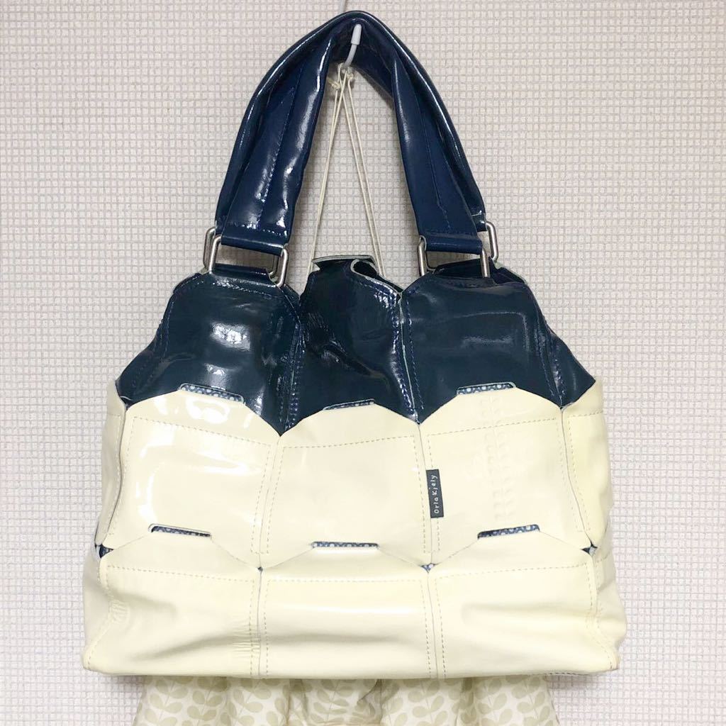 - 中古 orla kiely/オーラカイリー 本牛革レザー トートバッグ ショルダーバッグ(ブルー)
