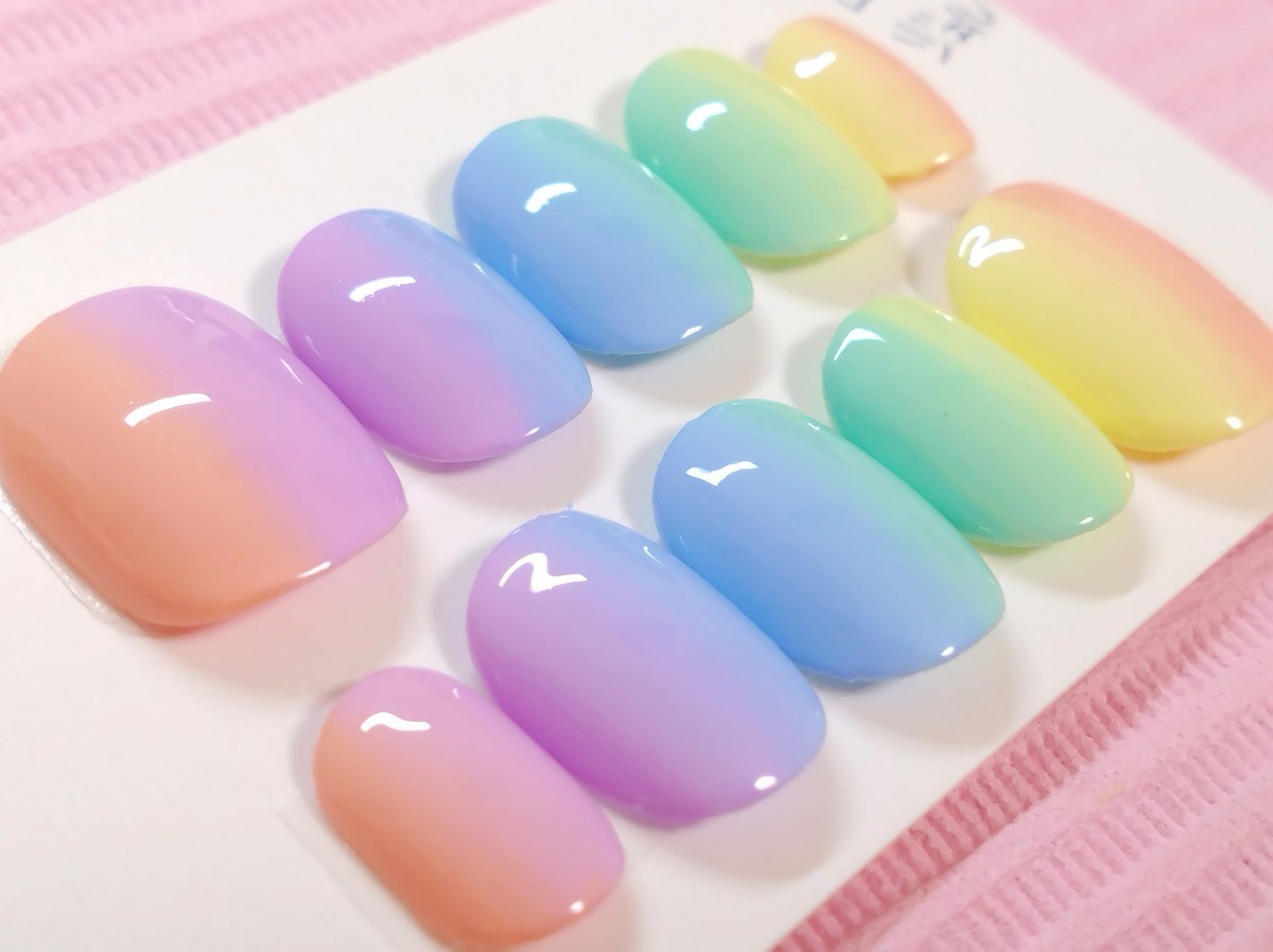 - 【ジェルネイル】Lサイズベリーショート・カラフルパステルカラーグラデーションネイルチップレインボーファンシー