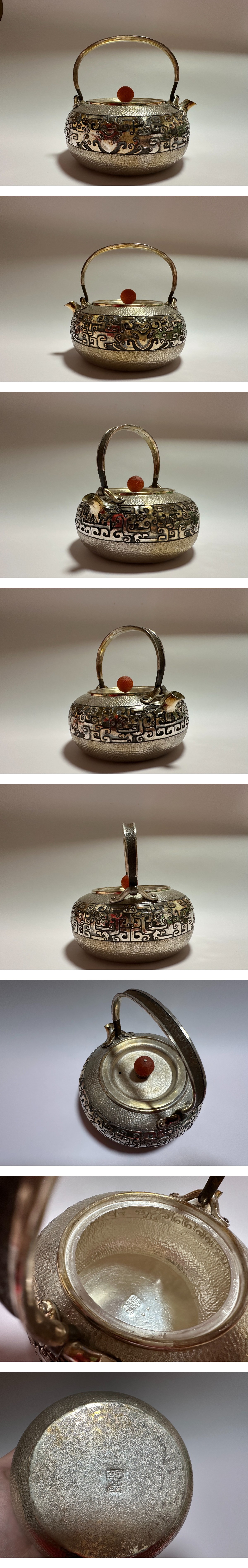 - 時代 純銀製 蔵六居造 饕餮紋 口打出湯沸 工芸品 古美術品 銀瓶 煎茶道具