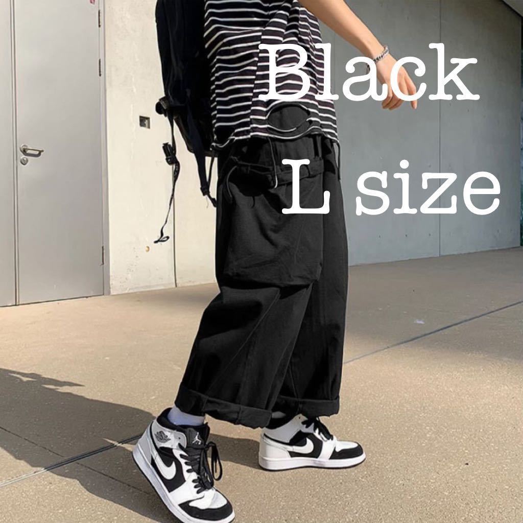 - ボトムス ワイドパンツ カーゴパンツ ワークパンツ ルーズパンツ ユニセックス 男女 黒 ブラック L