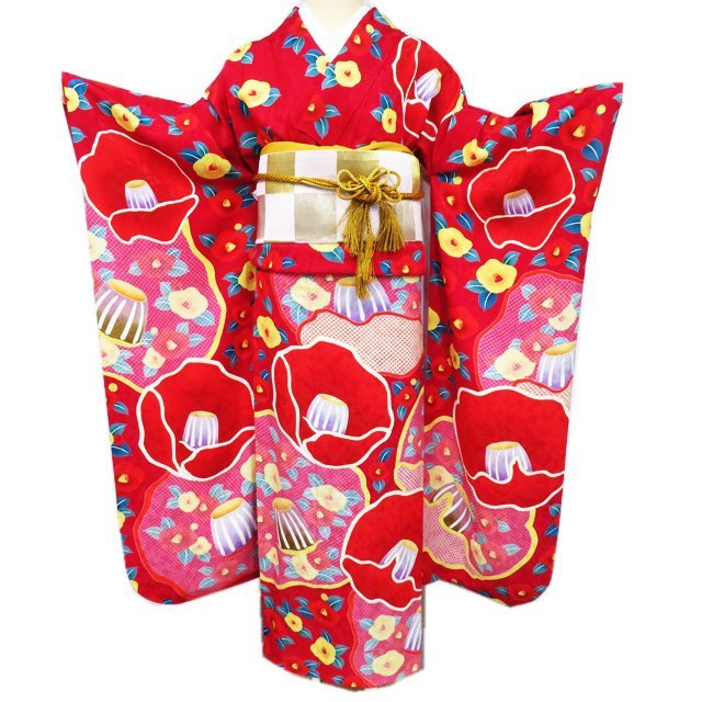 - 振袖 着物 中古 リサイクル 正絹 花模様 椿 鹿の子 赤色 多色 身丈171.5cm 裄69cm L トール きもの北條 A972-10