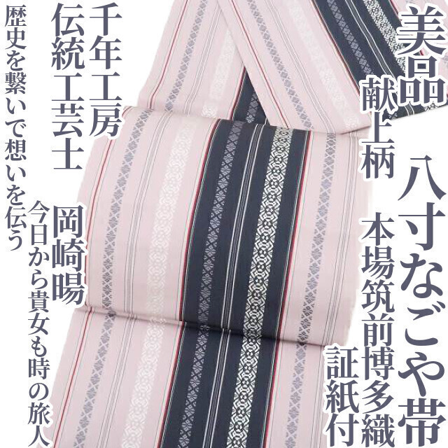> tomihisa 美品 千年工房 伝統工芸士 岡崎暘“歴史を繋いで想いを伝う貴女も時の旅人”献上柄 本場筑前博多織 証紙付 八寸なごや帯 2953