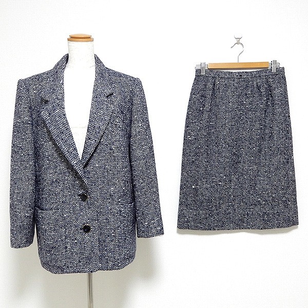- #wnc レリアン Leilian スカートスーツ シングル ツイード 膝丈 紺系 白系 ドイツ製生地 レディース [858847]