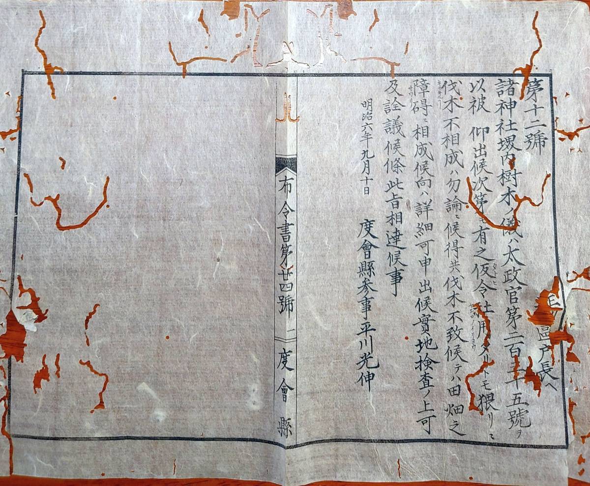 - f23022512〇明治布告布達 明治6年 諸神社堺内樹木の儀 社用たるとも猥りに伐木不相成 度会県 三重県 〇和本古書古文書