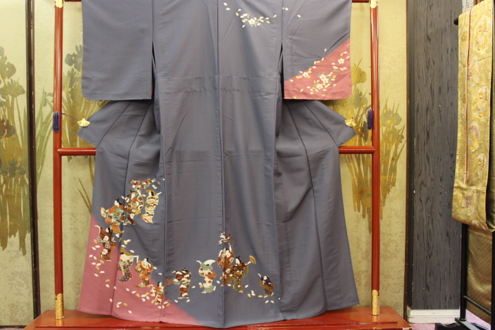 - きもの今昔6434 合繊のきもの 広衿単衣手縫い仕立て グレー色地啜煉瓦色に「出雲の阿国」の絵柄 身丈151cm