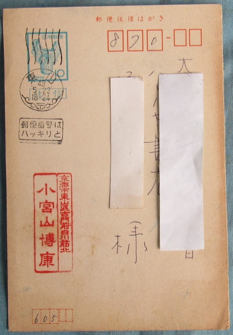 - 庭園師京都の人、小宮山博康、E51,10円土器官製はがき、昭和43年度消印、本人差し出し、日本庭園芸術協会、庭師、葉書少しヤケ