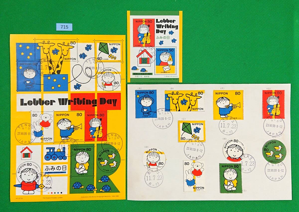- 初日印/ふみの日/切手シート/小型シート/解説書/1999年/少々汚れ有/武生天王欧文,和文普通印/福井五分市普通印/額面1730円/№715