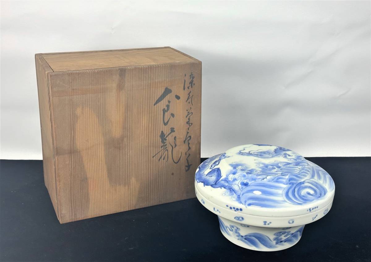 > E203●【龍紋染付菓子鉢 食籠】青華 青花 染付蓋物 青花蓋物 茶道具 煎茶道具 共箱 重さ:約981g 現状品
