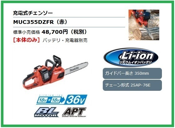 > マキタ 350mm 18V 充電式チェンソー MUC355DZFR (本体のみ) [ダブルナット仕様]【18V+18V→36V】 ■マキタ純正/新品/未使用■