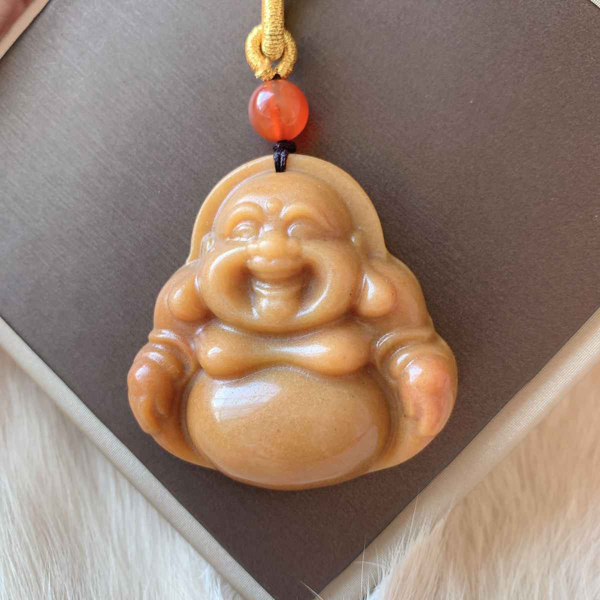 > ◇黄龍玉+赤瑪瑙1粒◇ネックレス◇ペンダント◇御守り◇弥勒形◇彫刻◇天然石◇巾着袋付き◇プレゼントにも 019P492