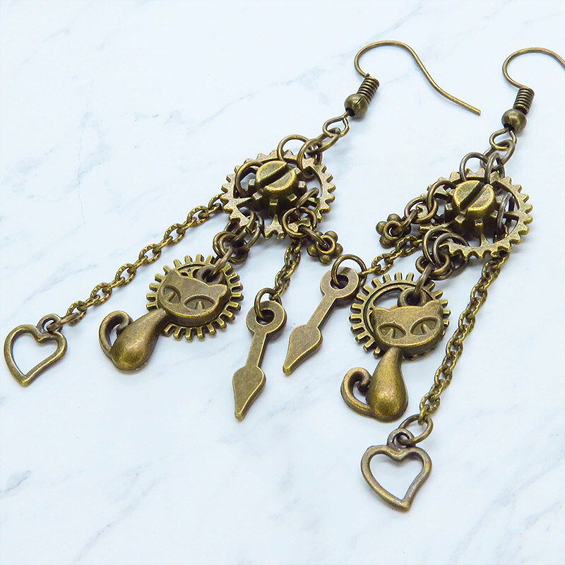 - アンティークゴールド 猫と歯車のコンパクトなスチームパンク風チェーンピアス