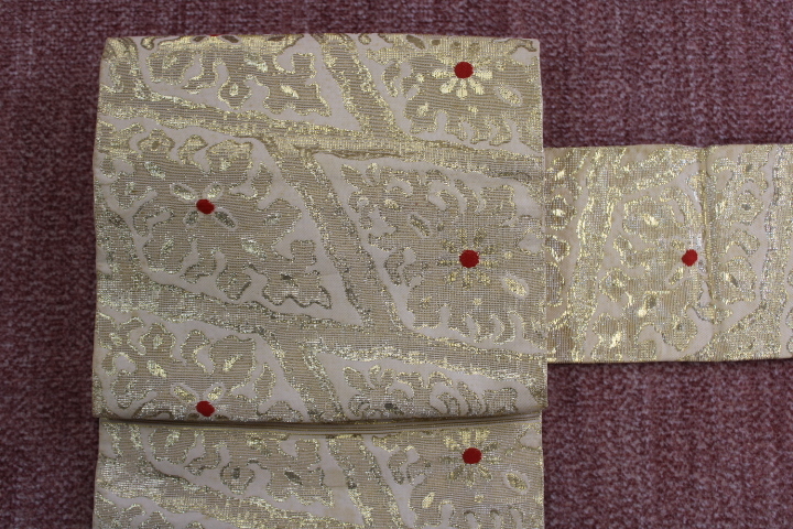 > きもの今昔6649 名古屋帯 西陣織九寸名古屋帯 白地に六通金銀糸柄出し崩し華文柄 帯の長さ334cm