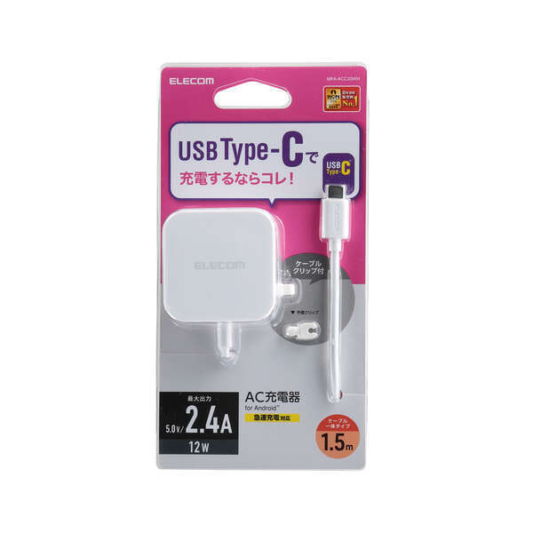 - USB AC充電器 最大2.4A出力 USB Type-Cケーブル一体型 ケーブル1.5m ケーブルクリップ付: MPA-ACC20WH