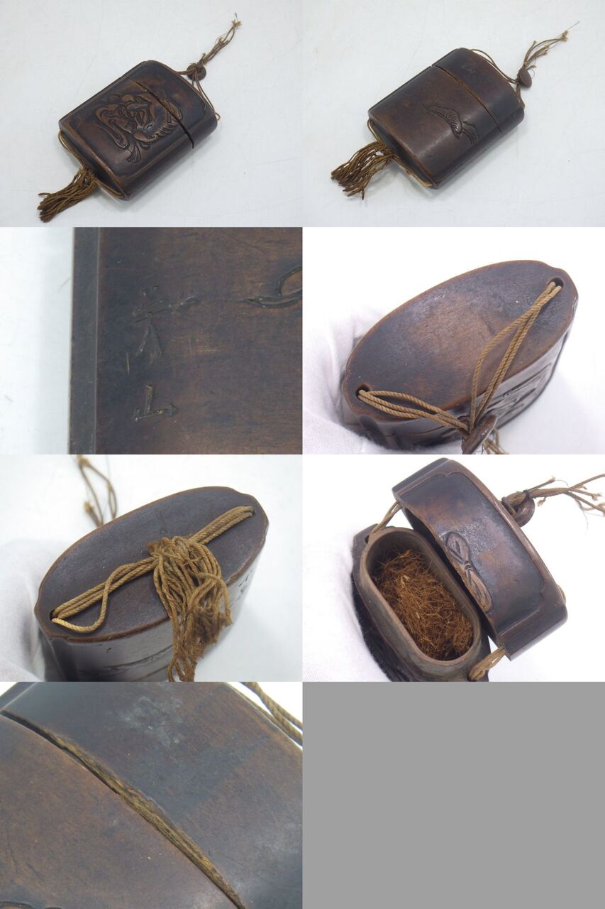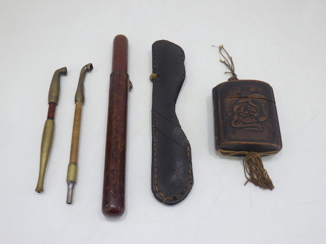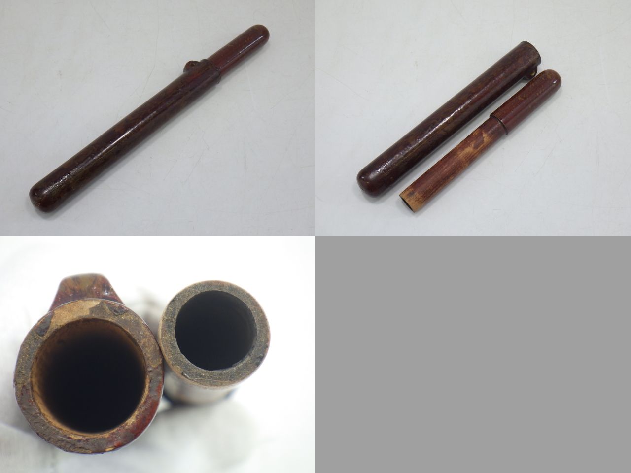 - h5C082Z0.1 時代物 煙草入れ 芳山銘 木製/煙管 キセル 煙管筒 キセル入れ 計5点