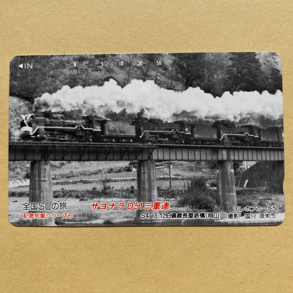 - 【未使用】鉄道テレカ 50度 全国SLの旅 記念列車シリーズ6 サヨナラD51三重連 伯備線長屋鉄橋(岡山)