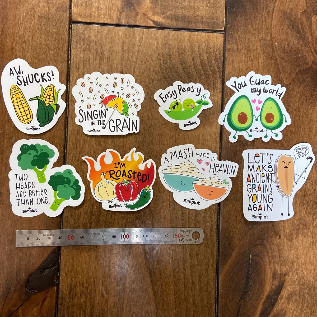 > Simplot 野菜Aw,SHUCKS! SINGIN’ IN THE GRAIN Easy Peas-y You Guacamole my world TWO HEADS ARE BETTER THAN ONE シール 8種類