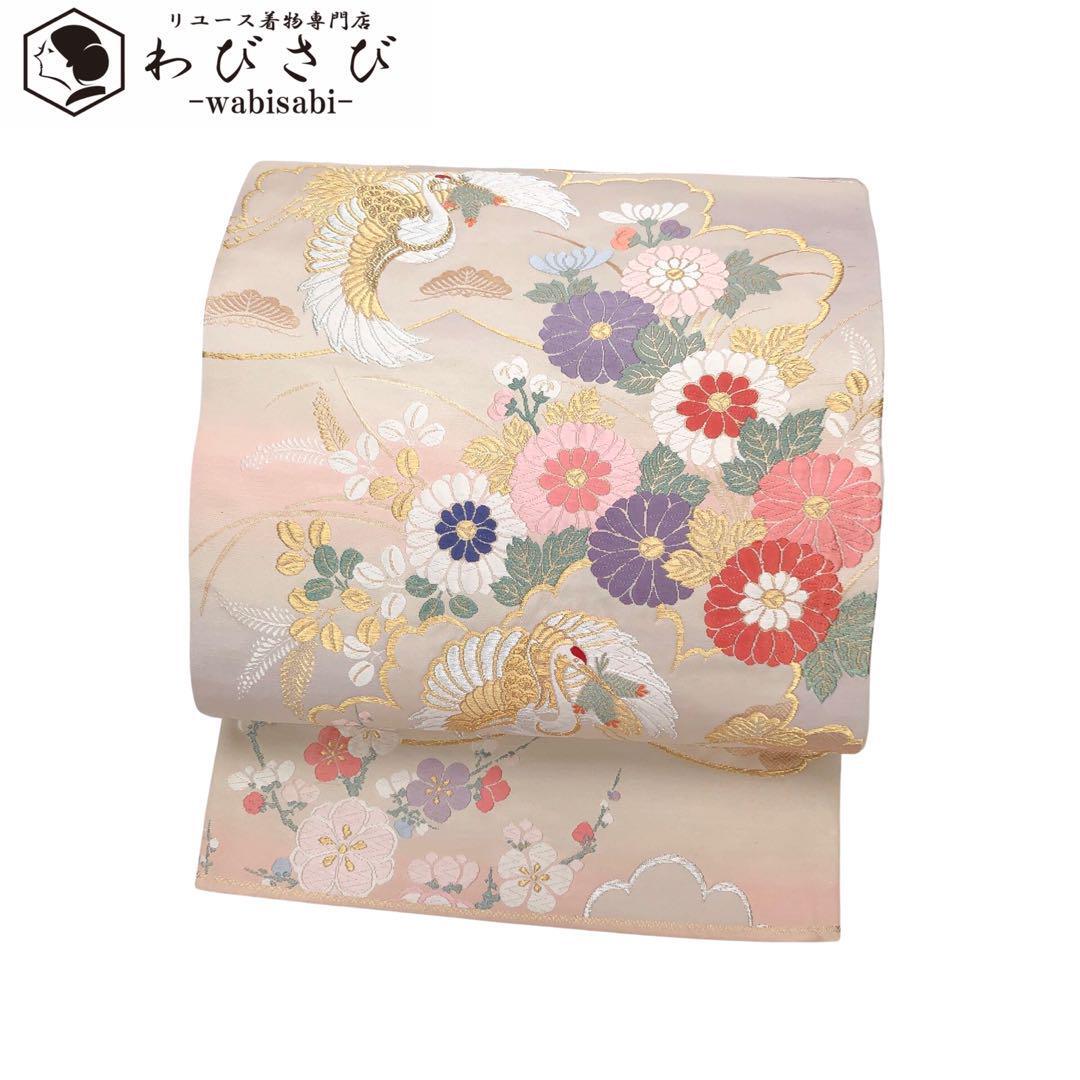- 袋帯 唐織 煌びやかな鶴に四季の花模様 松 金銀糸 暈し 乳白色 O-3576