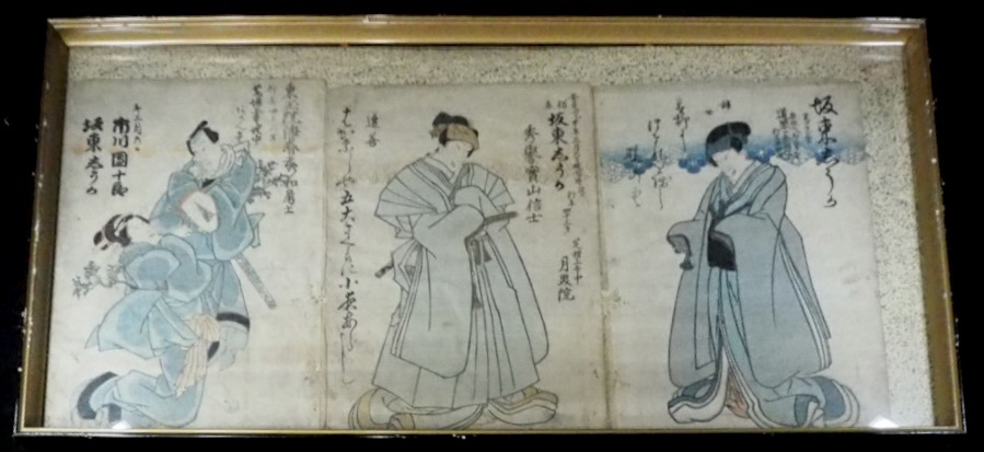 - 浮世絵木版画 錦絵 死絵3枚セット 額装品 「坂東志うか 市川團十郎(左) 」「初代坂東しうか(中) 」「坂東志うか(右)」 SMN604(4-2)