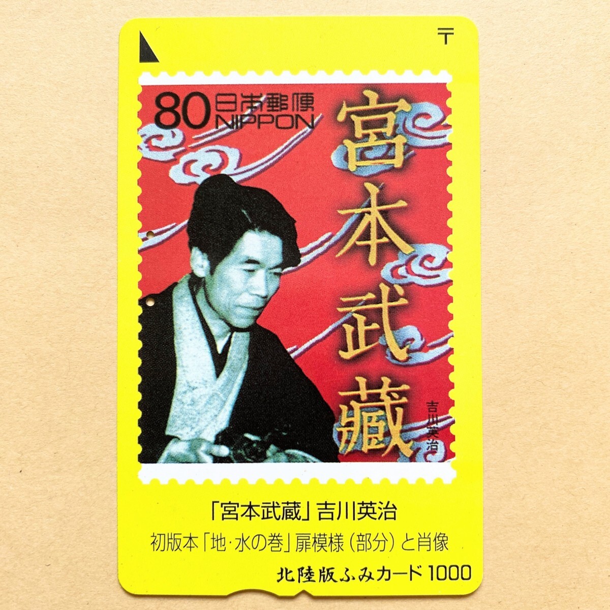 - 【使用済】 ふみカード 北陸版 「宮本武蔵」吉川英治 初版本「地・水の巻」扉模様(部分)と肖像