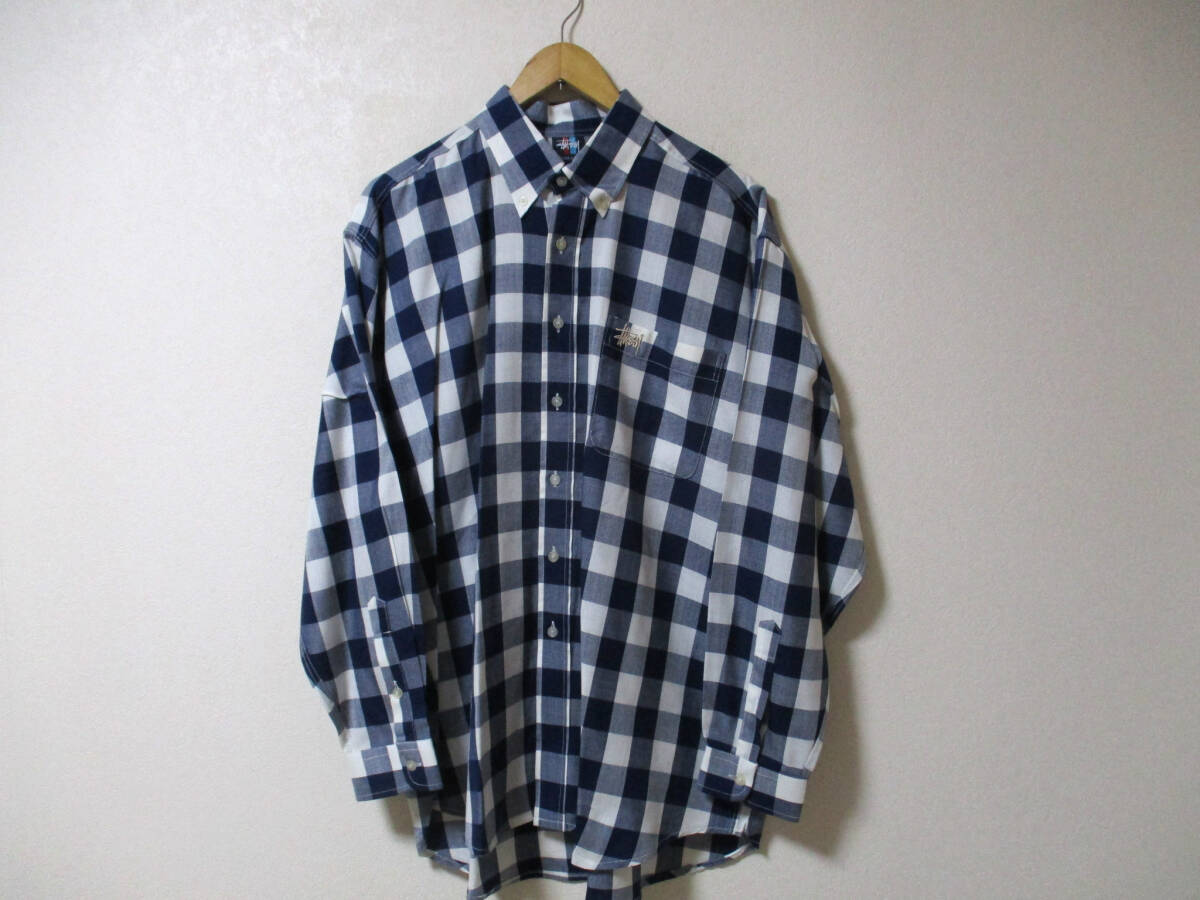 > STUSSY ステューシー ブロックチェック長袖シャツ 刺繍ロゴ オールド 紺タグ 90s ビンテージ XLぐらい? (3E オハ