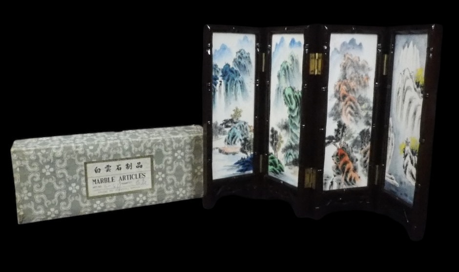 - 中国古美術 中国製 白雲石制品 手彩色「山花鳥両面卓上屏風」1980年代 OTS605