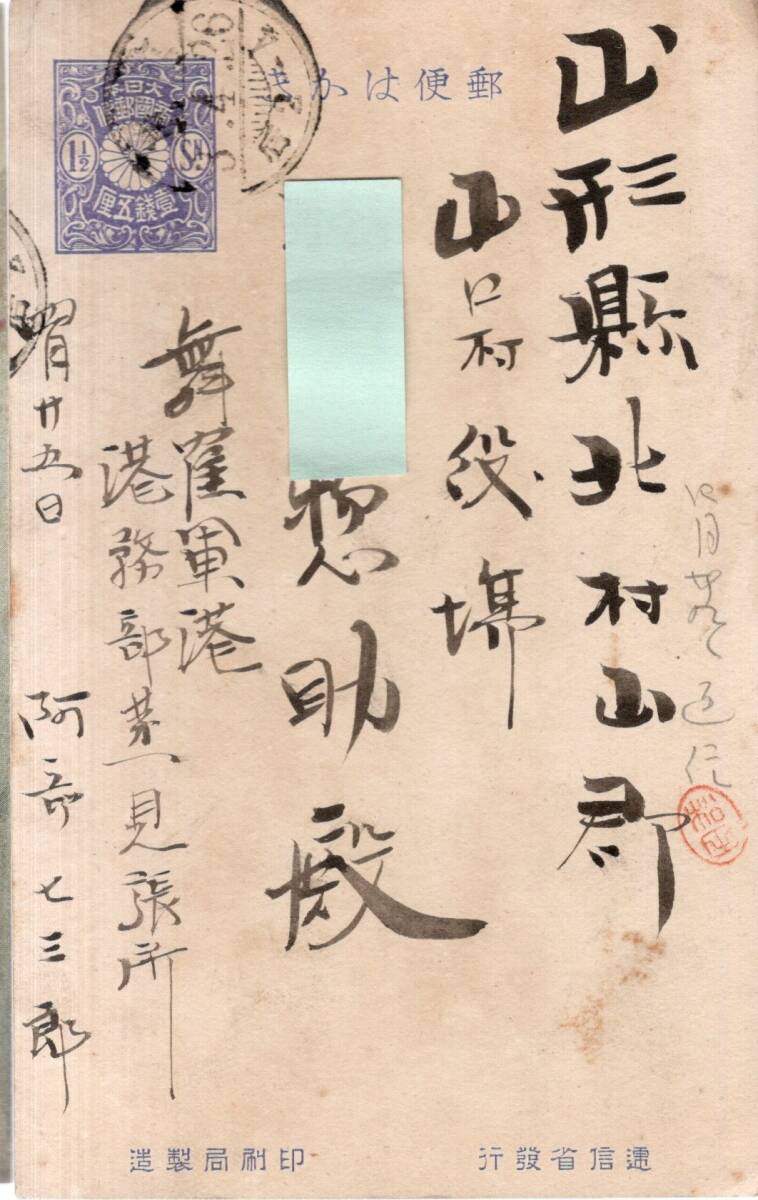 - 郵便はかき 舞鶴軍港港務部第一見張所某氏より山形県北村山郡山口村(現在の天童市)某氏宛 エンタイア実逓便葉書