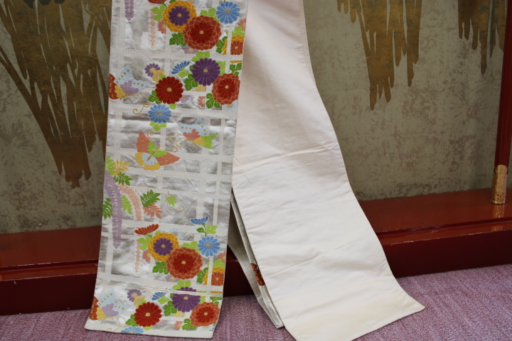 > きもの今昔7056 袋帯 西陣織 正絹金綴れ織風桐の花柄 渋い色使い 裏地色は淡いグレー色 帯の長さ403CM