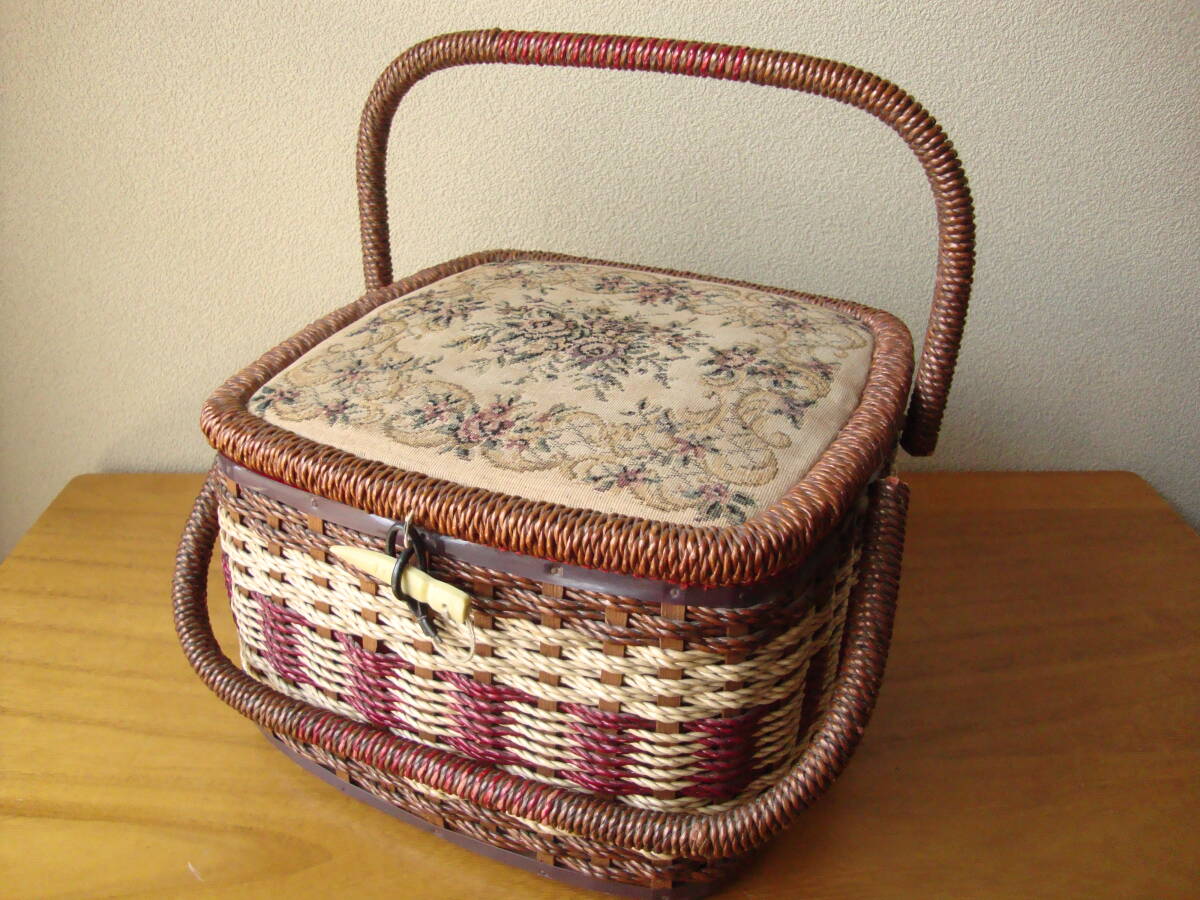 - レトロ 手編み 裁縫箱 ソーイング バスケット 薔薇 小花 ゴブラン織 昭和 ボックス