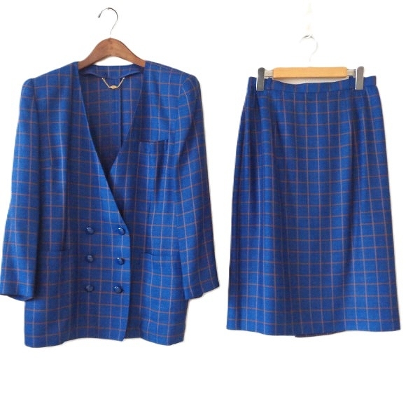 - #snc レリアン Leilian スカートスーツ 13+ 青系 チェック 麻混 ダブル ノーカラー 大きいサイズ フランス製生地 レディース [875840]