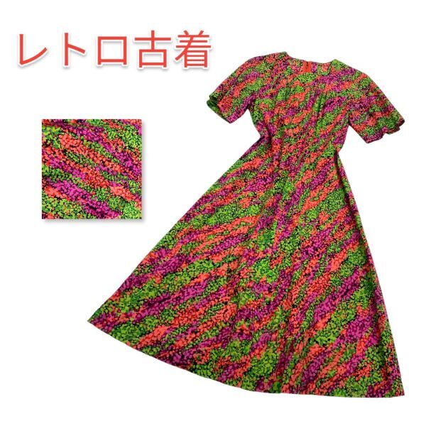 - 【レア】昭和レトロ ワンピース サイケ 総柄 ヴィンテージ ゆったり エレガント オートクチュール 特注品 匿名配送