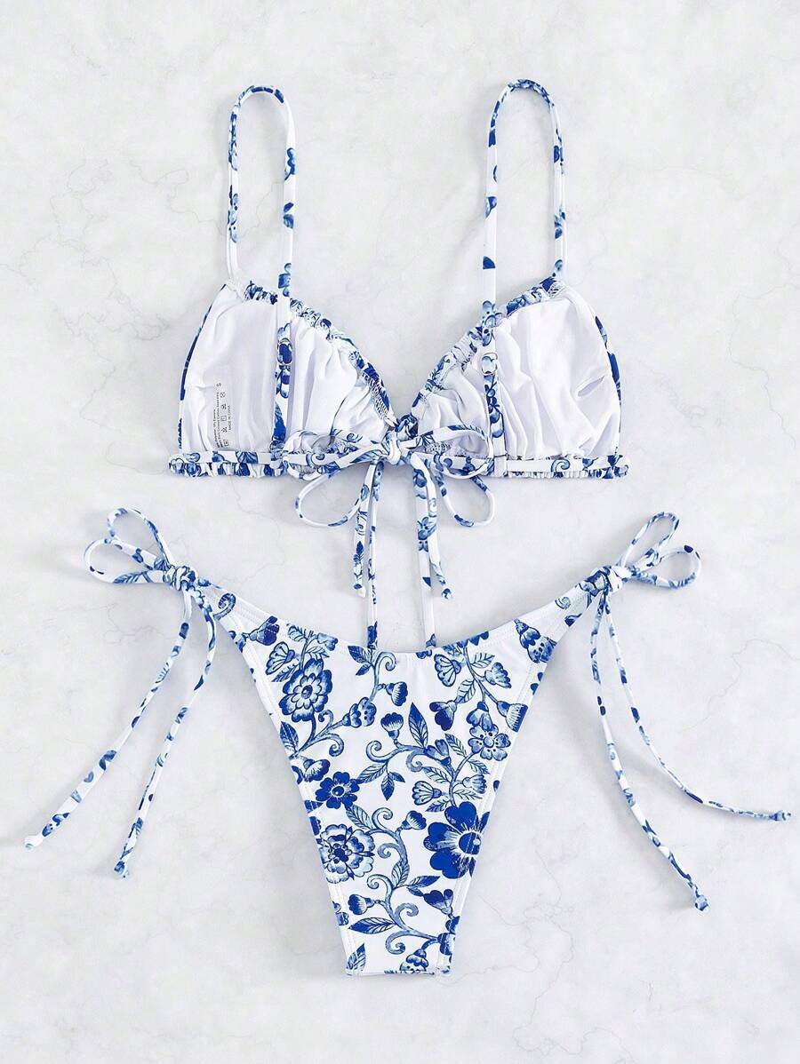 - レディース 水着 ビキニセット 女性用夏ビーチランダムプリントスパゲッティストラップビキニセット
