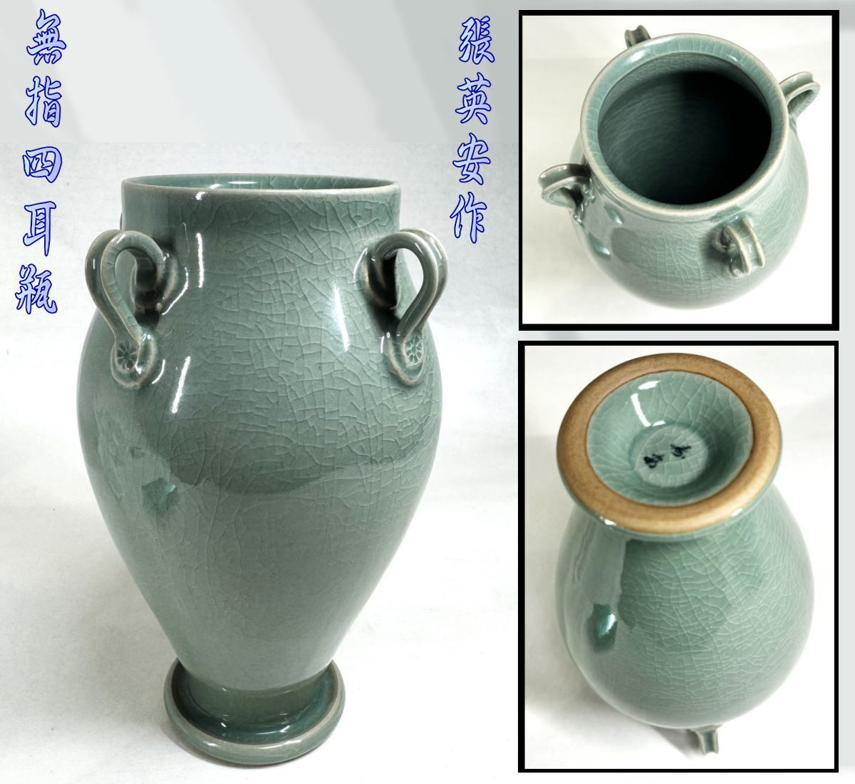 > 【送料無料】高麗青磁 壽安窯 張英安作(保証) 無指四耳瓶 骨董 時代品 古玩 朝鮮美術 古道具 細密細工 (旧家蔵出し) WWTT142