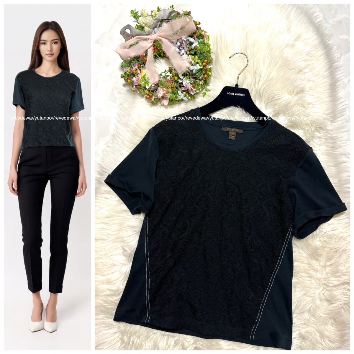 > 本物 美品 ルイヴィトン フラワーレース切替 ロールスリーブ Tシャツ トップス 34 黒 濃紺 LOUIS VUITTON (レターパック配送可)