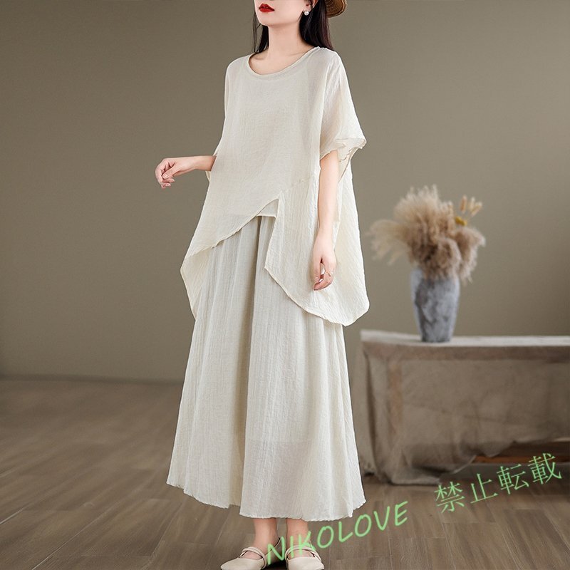 - 新品カジュアル大きいサイズ ひらひら半袖上着+ロングスカート3点セット 不規則 ロングスカートスーツ LE632