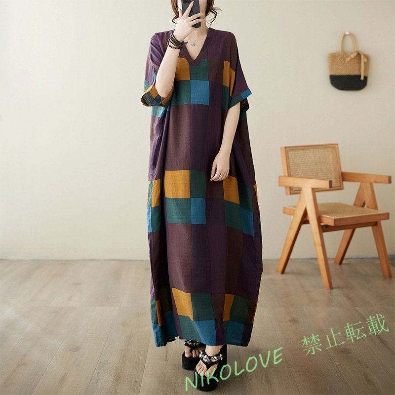 - 新品ゆったり大きいサイズ カジュアル Vネック 切り替え 大きな格子 半袖 ロングスカート ワンピース 紫系 LE959