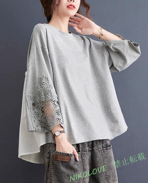 > 新品XL ブラウスシャツ カジュアル 無地 大きいサイズ トップス レースフレア袖 チュニック おしゃれ グレー LH262