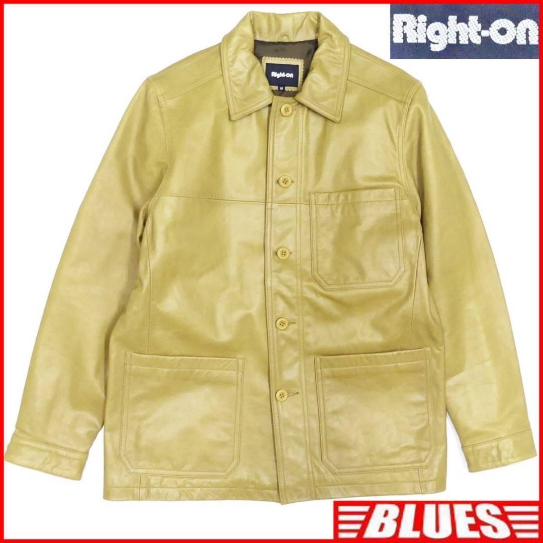- 即決★Right-on★メンズM レザーステンカラーコート ライトオン 黄 ベージュ 本革 ジャケット 本皮 ビジネス コート 革ジャン ハーフコート