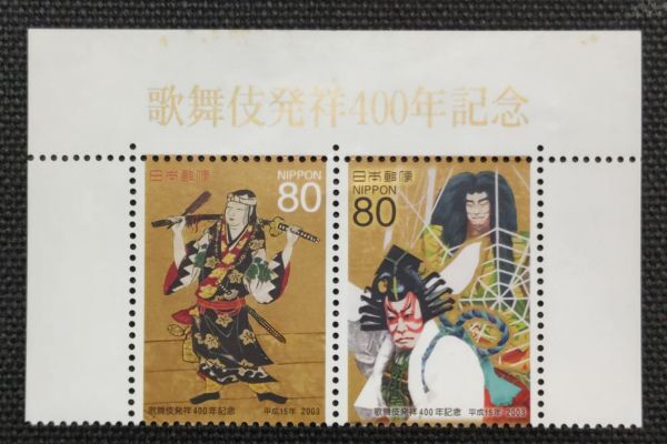 > [24060712]【歌舞伎発祥400年記念】2種連刷 タイトル付「阿国歌舞伎図屏風 暫と土蜘」出雲阿国 市川園十郎 尾上菊五郎 80円×2 2003年 美品