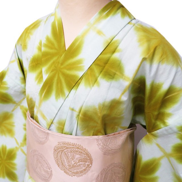- 夏物 浴衣 着物 未使用 木綿 カジュアル 板締め絞り 鶯色 多色 身丈162cm 裄66cm M きもの北條 A1035-13