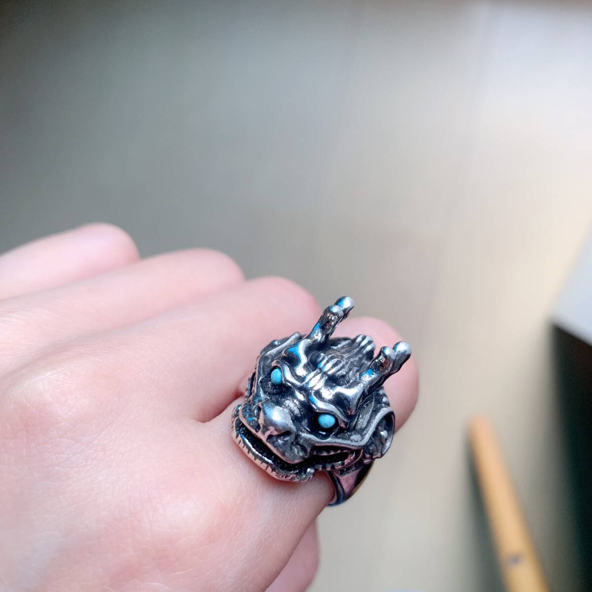- ◇ターコイズ2粒◇龍頭◇指輪◇リング◇男性用◇フリーサイズ◇天然石◇パワーストーン◇巾着袋付◇プレゼントにも 030r61011