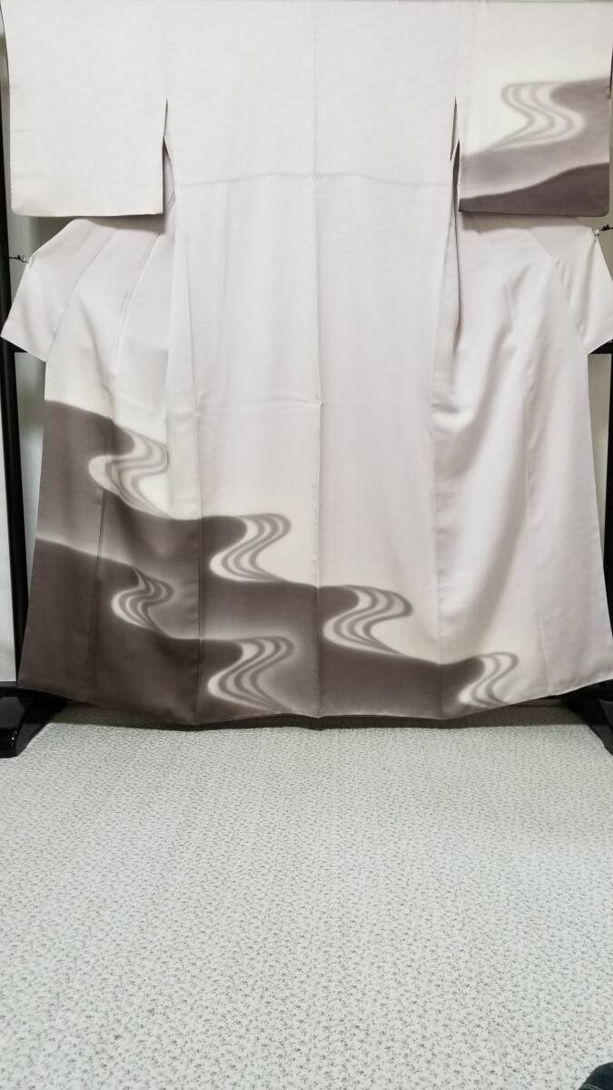 - 【桐徳】訪問着☆送料無料*流水文様☆逸品物*美品{正絹*袷.訪問着}*身丈165-裄67*薄い薄い藤色地*葡萄鼠色.手暈し染の流水文様*№6641