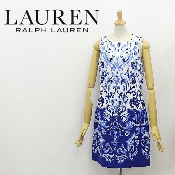 > 新品 国内正規品◆RALPH LAUREN ラルフ ローレン ストレッチ 総柄 ノースリーブ ワンピース ホワイト×ブルー 2