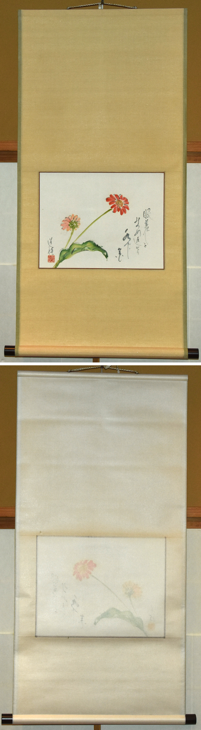 - 【真作】道穂 (筆) 花車(ガーベラ)画賛 紙本 肉筆 掛軸 軸 書画 絵画 静物画 日本画 古美術 骨董 z7576o