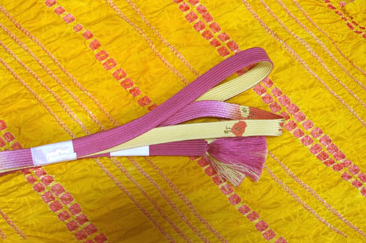 帯締めは黄色.ピンク.赤の色合いで花柄があります。平織りです。幅約1.5㎝。