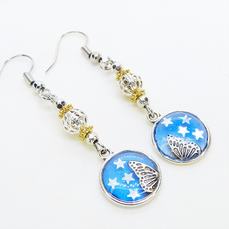 - アンティークシルバー 蝶々の羽モチーフとメタルビーズを組合せたコンパクトなピアス サージカル可